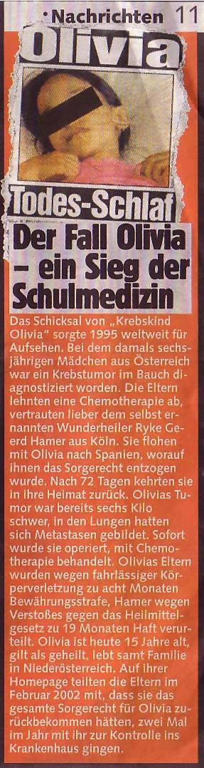Klingt so, als ob die Eltern von Olivia wieder auf den"rechten Weg" gefunden hätten. Aber stimmt das? Gehen Sie auf die homepage von Pilhar, erleben Sie, daß er immer noch für Dr. Hamers Neue Medizin eintritt und überall Stammtische gründet: Lügt BILD oder sagt BILD einfach nicht alles, was dazugehört. Wer trägt hier Verantwortung, wenn die Neue Medizin stimmt? ...und sie stimmt! Finden Sie es auch heraus. Was ist, wenn alles ans Licht kommt?? Bernd Joschko